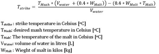 But hey, what about infusion? Infusion is the point in time where we add the malt to the preheated water. It's also called the strike temperature. The colder malt mixes with the water and cools it a little. Therefore, the infusion temperature can be calculated from the mass of water and malt using the amount of them both and the temperature of the malt (Figure 6). So if the desired infusion (or strike) temperature is 55°C, the amount of water is 19 liters, and the 7kg of malt is 14°C, we can calculate that the water should be preheated to 59.8°C before adding the malt. After a short while, it'll find its rest at 55°C.
