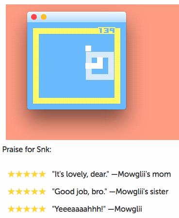 My favorite part of the project is actually the “reviews” for it. Head over to www.mowglii.com/snk to grab Snk and its source code today. And, good luck with level three; I run directly into the wall every time!
