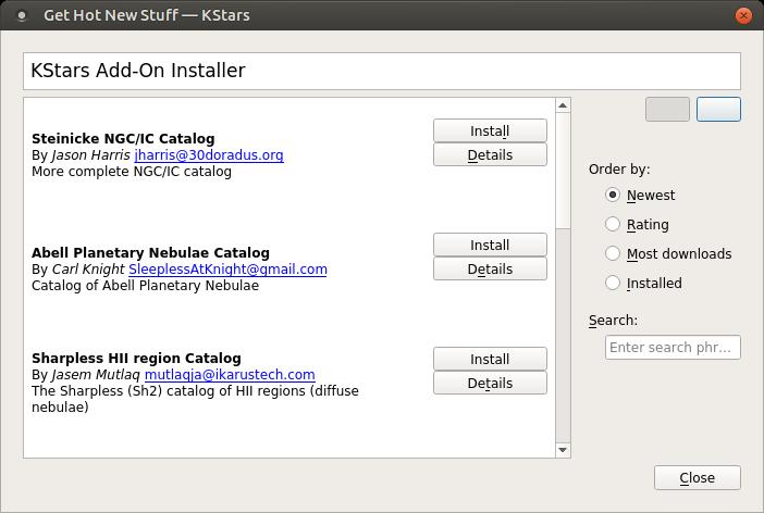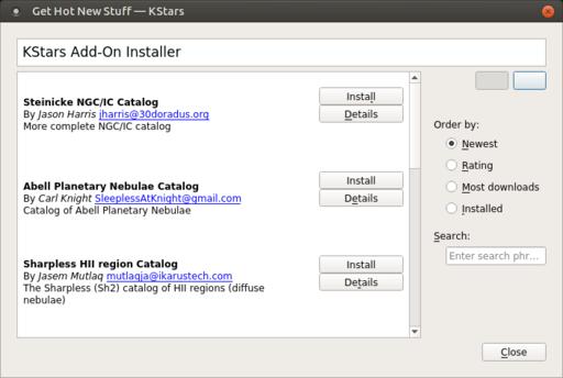 Although KStars comes with quite a bit of data when you install it, this isn't everything that is available. You can add new data sources by clicking on the menu item Data→Download New Data. This will open up a new dialog window giving you a list of what data catalogs are available to download.