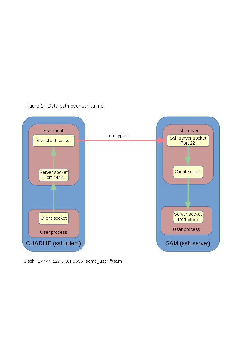 When an arbitrary user process creates a client socket and connects to the server socket at 4444, the SSH process encrypts the data, then transmits it over the SSH connection (established in step 1) to sam.