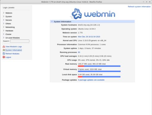 Webmin 1.7x: Webmin is a browser-based tool that makes administering (and understanding) a Linux server a lot easier. Hard-core command-line junkies will scoff at the GUI, but those new to Linux will appreciate Webmin's power and flexibility for managing everything from Apache Web services and Postfix-related mail services to updates and system health. You'll install Webmin on your base Ubuntu 14.04 VM template and use it on every server thereafter.