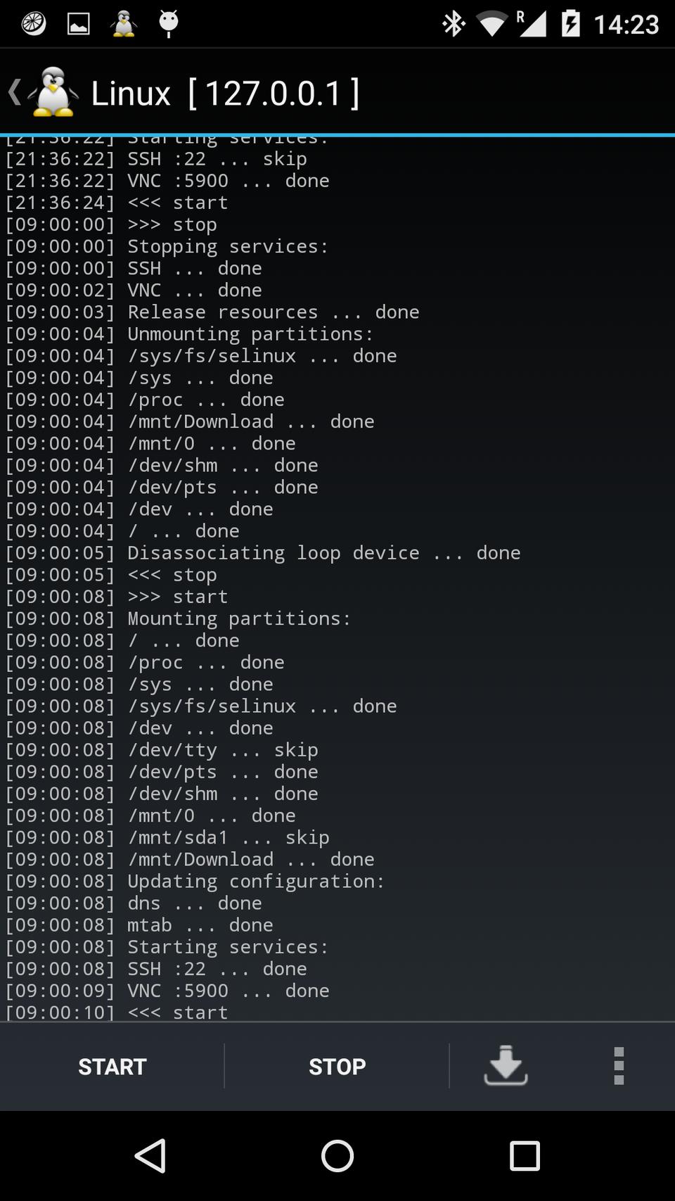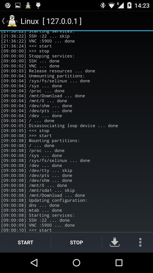 Starting the Linux OS starts an SSH server (port 22) and a VNC server (port 5900), which allow you to access the Linux OS from Android via the terminal and a GUI, respectively. The following steps detail how to set up an SSH connection via JuiceSSH and then how to set up a VNC connection via VNC Viewer: