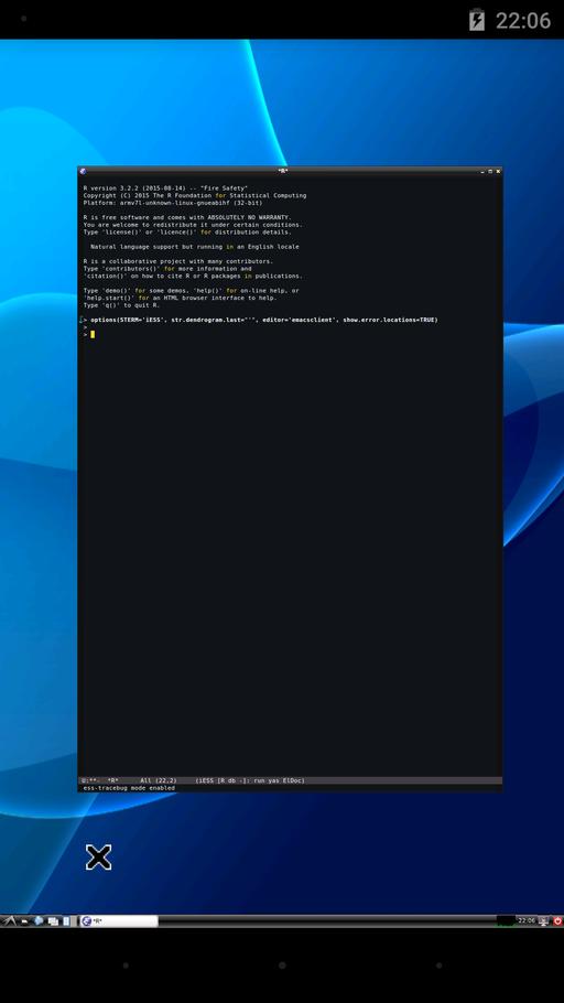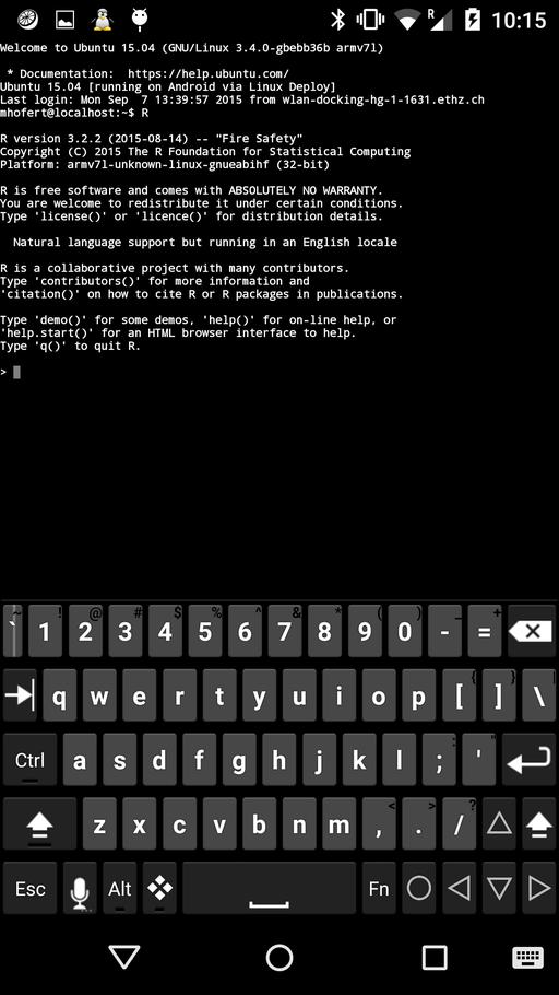 The input device: although technically possible with the Hacker's Keyboard, it's not practical to interact with the smartphone only over the software keyboard (a large tablet might be a different story). We connected a Bluetooth keyboard to the Google Nexus 5, but had problems allowing features like a more productive remap of the Ctrl key to Caps Lock. The app “External Keyboard Helper Settings” might be a solution here, but we could not get this (and other features) to work. We did not go as far as utilizing xmodmap for that purpose, as ideally, this should be solved on Android. For our proof of concept here, using the Bluetooth keyboard worked well, but the input device used to interact with Android or the Linux OS (and thus R) is still one of the major productivity bottlenecks. Also note, that the behavior was somewhat different when connected via SSH or via VNC. For example, the Emacs key combination C-space for the command M-x set-mark-command did not work when connected via SSH with JuiceSSH, but it worked when connected via VNC with VNC Viewer. Keyboards more specifically designed for Android devices and with more focus on productivity might be interesting here, such as the recently introduced LG's Rolly keyboard (which also would be easy to carry around).