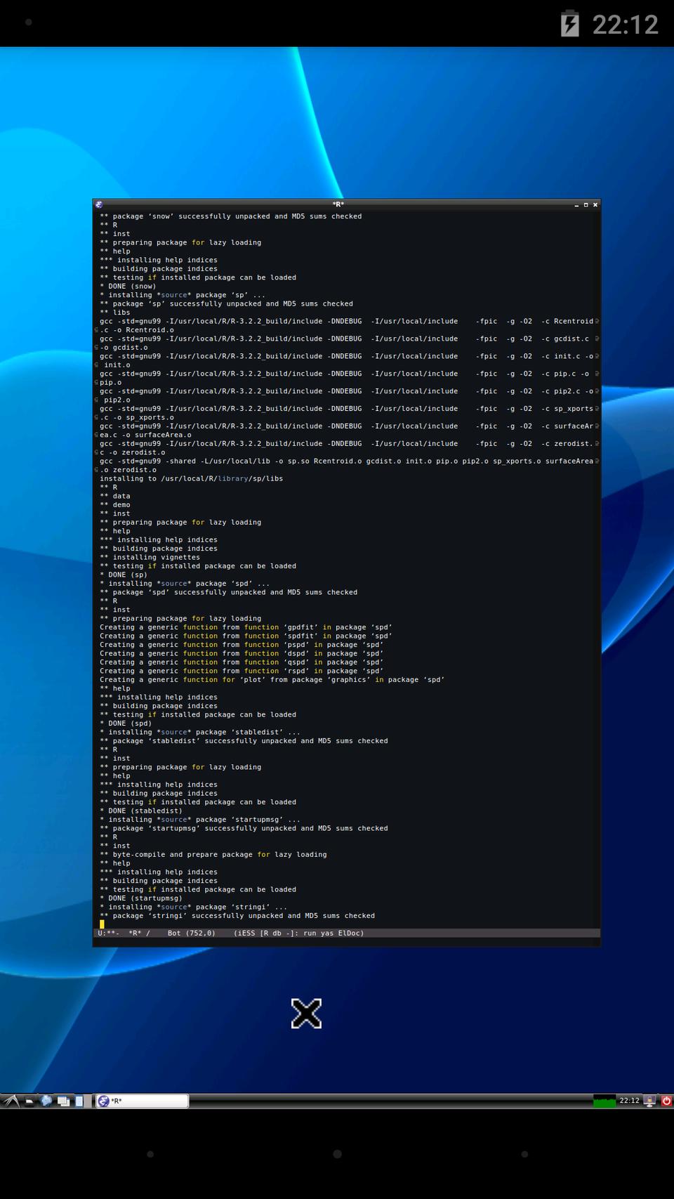 The goal now is to install a Linux OS (in this case Ubuntu 15.04; during our testing phase, we also considered Debian Testing) in a chroot environment on Android 5.1.1, together with various productivity tools, such as Emacs (version 24) with ESS and TeX Live with AUCTeX. The Linux Deploy app provides a relatively straightforward approach for installing Linux on Android (described below), and updates to Android 5.0 and 5.1.1 also were provided in a reasonable amount of time (and the developer replied to questions).