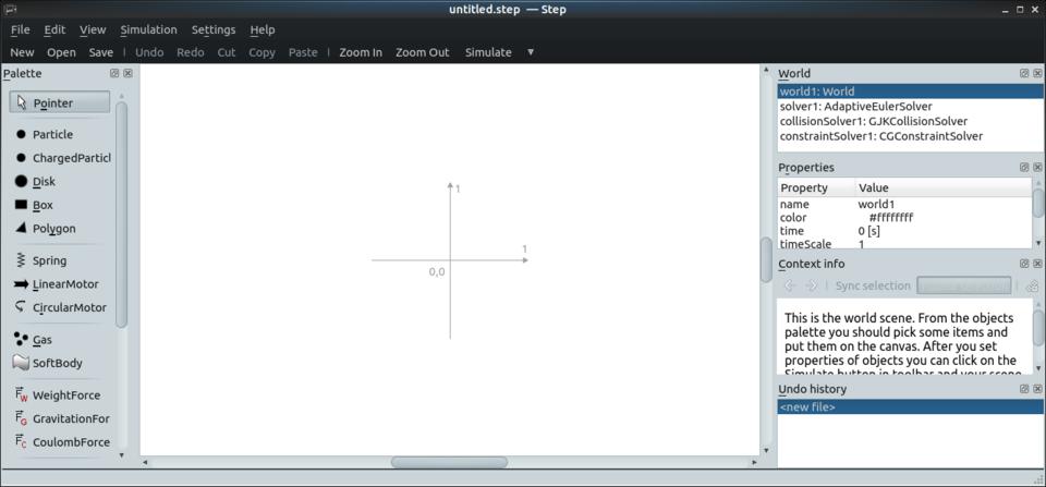To start Step, you either can find it within your desktop's menu system or open a terminal window and run the step command. When it starts up, you'll get a new, empty project in which to build your simulation.