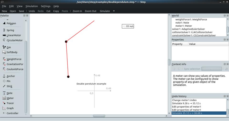 Sometimes, however, this isn't good enough. You may need to have numbers tracking what various elements are doing within the simulation. Luckily, Step provides three measurement objects: meters, graphs and tracers. As an example, let's add a meter to monitor the speed of the first particle in the double pendulum example.