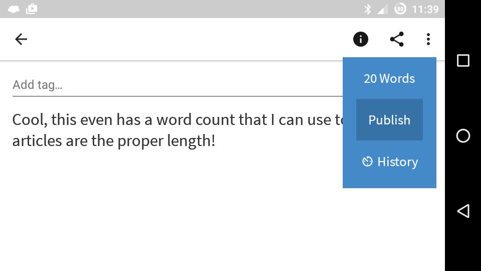 The Android app does pretty much all the same things the desktop or web-based app does, and it syncs between devices automatically. With many “syncing” apps, I find it frustrating that the syncing isn't reliable or consistent. I have to admit, this one seems pretty solid. Perhaps it's because it does text and only text—I'm not sure.