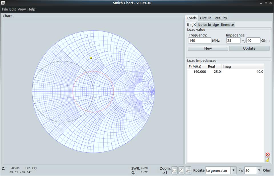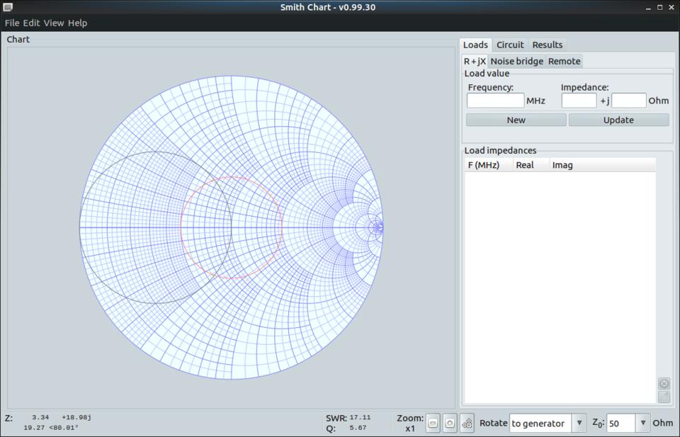 When it first starts, you will see a blank Smith chart, ready for use. On the right-hand side of the main window is a set of tabbed panels where you can enter the details of the electrical problem you are working on. This section is broken into loads that you can apply to the system, a circuit tab where you can define discrete circuit elements that are part of the problem, and a results tab where you can find a running log of the calculations being made.