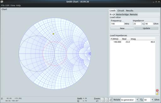 Once you're done, you can save your work in a few different ways. Under the File menu item, you can select to save either circuit details or load details as a separate file. Each of these sub-menus allows you to save data or load previous data. You also can import data from CSV files and s2p files. To save the final results, you can print the resultant Smith chart either by pressing Ctrl-P or by selecting the File→Print menu item. This way, you can save the chart to a PDF file. Hopefully, linsmith will be a useful tool for electrical engineers to add to their toolboxes.