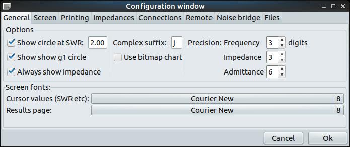 Clicking on the Edit→Preferences menu item will open a new window where you can set several preferences for how linsmith can work. Several tabs covering several sections of options are available. The first tab, General, sets the most basic of parameters. The screen tab lets you set the image used as the background of the Smith chart, along with what colors you want to use for the various elements. The printing tab lets you set the paper size and margins, along with the colors to use for each of the parts of your Smith chart.