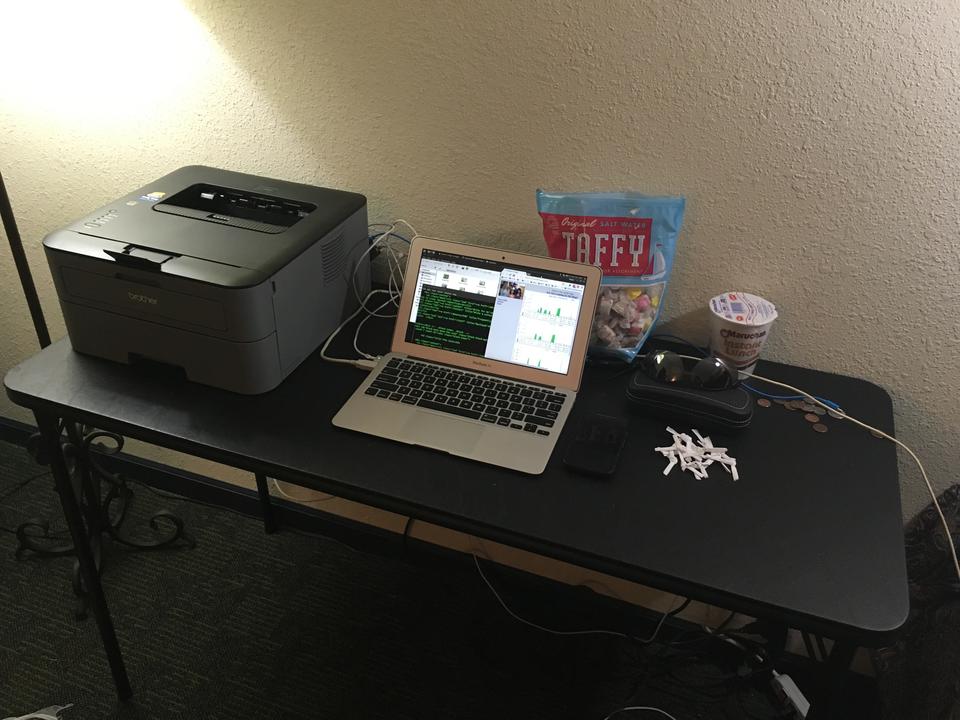 Usually, if I'm staying at a hotel while traveling, there will be some sort of desk in the room that I can take over as a temporary workstation. The room I'm in this week doesn't actually have a desk, so I had to run to the local department store and buy a table. Figure 1 shows the table I bought. It was $29, and I have no idea how I'm going to fit it into the car to bring home. You can't see the chair in the photo, but it's a folding chair I “borrowed” from a conference room. Metal folding chairs hurt your rear end after a while, so for a cushion, I'm sitting on a bag of dirty clothes. Yes, I travel in style, and I'm super classy.