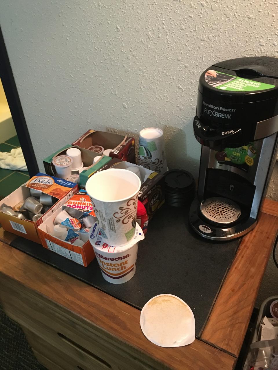 The other side of the room has a little nightstand (Figure 2), which was oddly placed nowhere near the bed. That's okay, because I used the table to set up a coffee station. The room also didn't have a coffee pot, so I picked up this single-serve Keurig-compatible coffee pot for $29. It's terrible. Seriously, if I reviewed coffee pots for a living, this would be my example of the worst coffee pot I've ever used. Still, I can't work in a room without coffee, so for the week, I'll just suffer. But I'm leaving this pot here; I don't want it at home. (And yes, I don't eat terribly healthy on the road. Ramen is about it. You can cook only so many things with a subpar, single-serve coffee pot.)