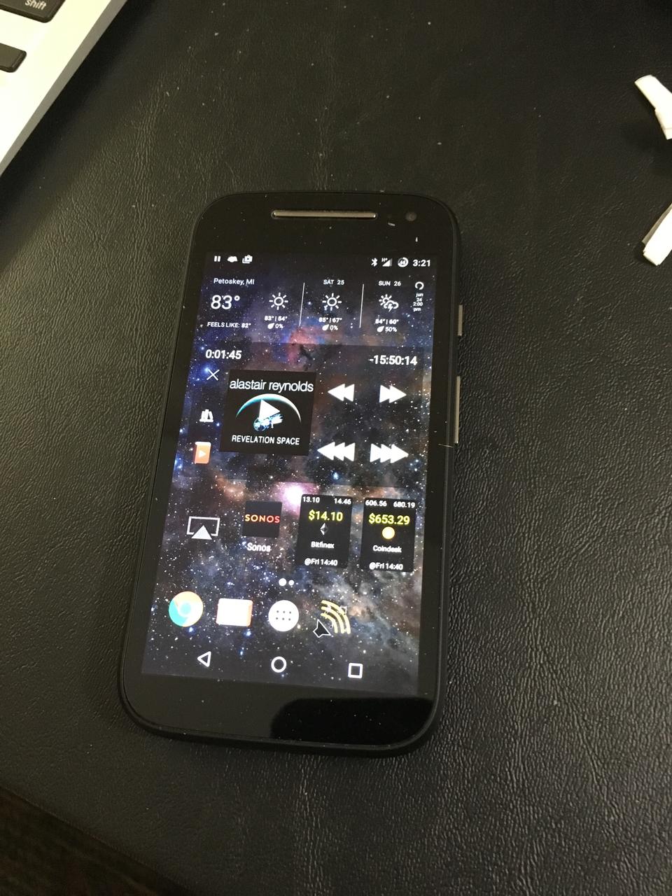 Listen: most of my “reading” is done via audiobook. I love Audible, but I hate its app. Listen is hands-down the nicest, most incredible audiobook player I've ever used. It's an Android-only app and worth every penny. (I think it was $3.) I use FolderSync on Android to keep my audiobook folder up to date, and I just copy the audiobooks I want into a sync folder on my home server. Every night it does an SSH/rsync copy of books to my phone. Oh, and I use an LG HBS-730 Bluetooth headset for listening to the books. I imagine I could talk on the phone with the headset too, but I've never talked on that phone because who actually “talks” on phones anymore? (Okay, it's because my day-job phone has the number everyone calls.) Anyway, the combination of Listen, FolderSync and those LG headphones supplies about 90% of the entertainment on any given trip for me.
