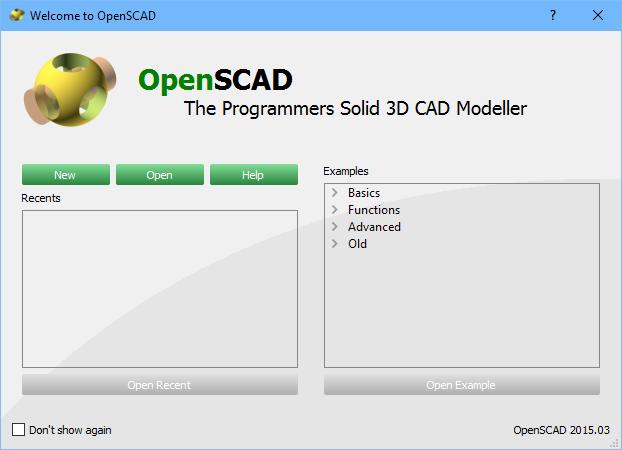 You can start OpenSCAD from a menu entry in your desktop environment or by executing the openscad command from a terminal window. When it first starts, you'll see an initial window where you can select from a list of recent files or choose from the list of installed example files.