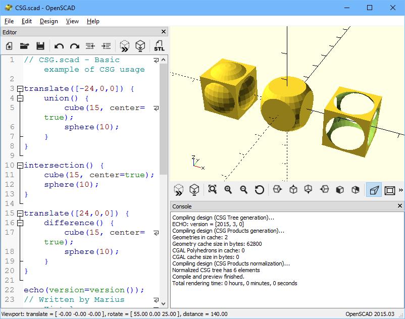 To get started, let's look at one of the example files—in this case, let's look at the first one: CSG.scad. The default layout consists of three separate panes. The main pane on the left-hand side is the main editor where you can define all the parts of your 3D design. The right-hand side is divided into two more panes. The top half is where the final 3D-rendered object is displayed. The bottom half is a console pane where messages are displayed. These messages could include messages from the rendering section. The viewing pane is a standard 3D viewing pane.