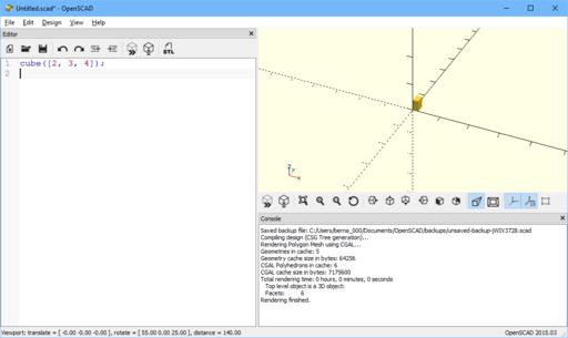 When you are ready to start a new project, you can click on the menu item File→New or press Ctrl-N. This will pop up a new window with an empty editor. Unlike many other CAD systems, OpenSCAD doesn't include a toolbox of objects that you can click and drag to build up your object. Instead, you need to type in the specifications for each of the elements for your design. As a simple example, you could add a cube with dimensions 2x3x4 by typing: