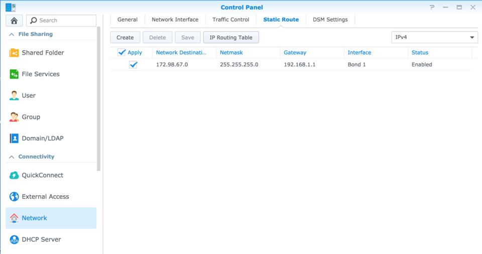 I have a network address assigned on my local network so LAN computers can connect. That works fine. Without a gateway specified, however, the NAS can't connect to the internet for torrents, SickRage or even system updates. But when the VPN is connected, it sets the gateway address automatically to an address on the other side of the VPN (Figure 4). As long as my VPN is connected, the system has a gateway assigned, and it can access everything through the VPN. If the VPN goes down briefly, rather than defaulting to the local network gateway, it just can't connect to the internet. Once the VPN is re-established, it reassigns a VPN gateway, and boom, the NAS is back online!The only problem is how can I connect to the VPN if I can't get on the internet? The answer: static routes.