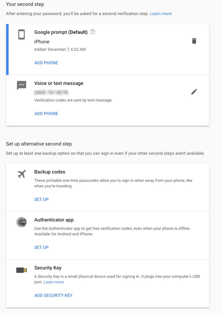 When you turn on 2-step verification (Figure 4), you're able to configure multiple 2FA options and set a default. I use the Google Prompt (described previously) as my default method, but I also have my phone number as an option. Plus, Google allows you to configure a number of alternates like a USB hardware key, printable offline codes and an authenticator app that will generate 2FA codes even while your phone is offline. Truly, it's the variety of options that makes me love Google for my 2FA needs.