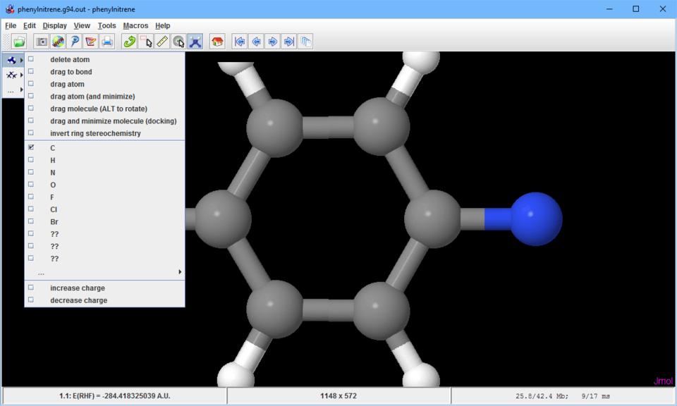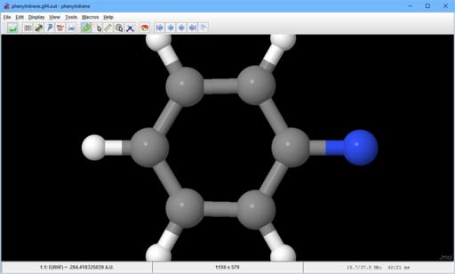 The simplest example is just to load a data file and see what it looks like. Figure 2 shows what you get when you load the sample file Jmol-datafiles/gaussian/phenylnitrine.g94.out.