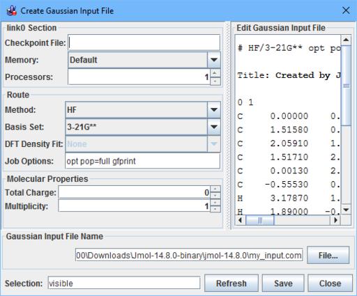The last export option is Write State, which saves the current workspace so that you can reload it later and continue your analysis. There also is an extra output option under Tools→Gaussian that pops up another window. Here you can set several options for a Gaussian input file that you can then use to run further simulations of your molecule.