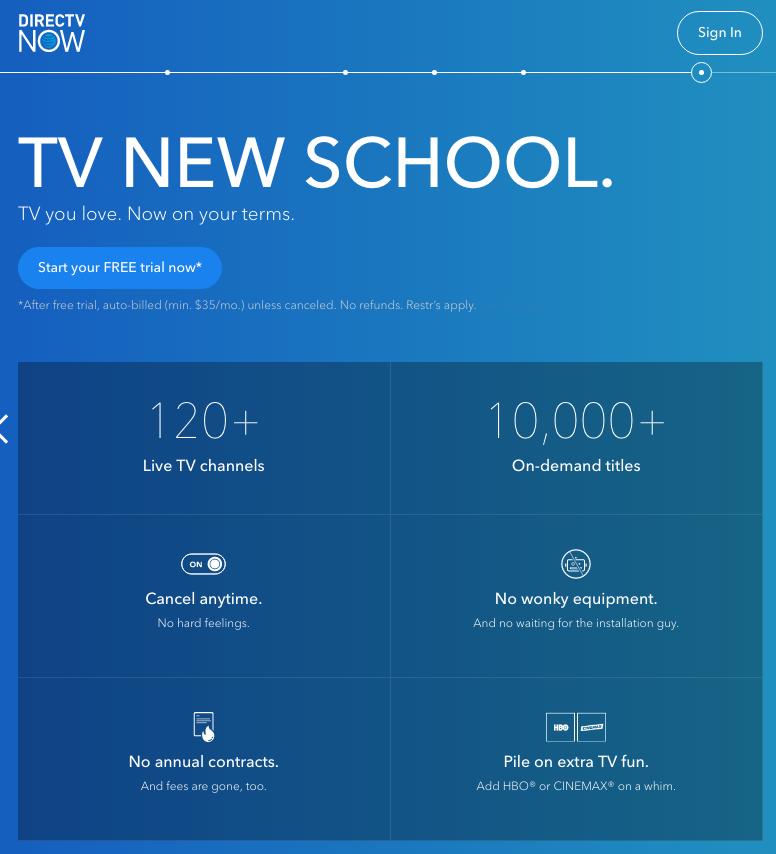 Figure 3. DirecTV Now is the new kid on the block. The $35/month is a trial cost and likely will increase before this article is published.