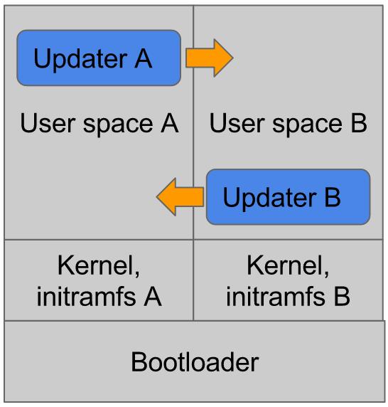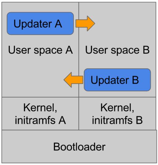 The method for deploying updates impacts the required downtime the most. For example, for full image updates, it's possible to deploy the update from a maintenance mode or use a dual-A/B rootfs approach. The maintenance-mode approach works by rebooting into a maintenance partition, installing the update to the root filesystem partition and then rebooting into the root filesystem partition again; the device is unusable for all of this period. In a dual-A/B rootfs approach, the update is installed to the inactive root filesystem while the device can continue to be used. The downtime in this case is only during the reboot into the updated (previously inactive) partition. The dual-A/B rootfs partition update design is shown in Figure 5.