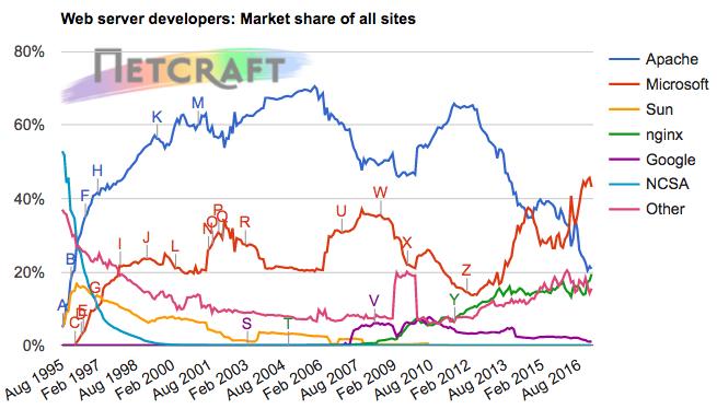 Figure 2 is from Netcraft's February 2017 Web Server Survey (https://news.netcraft.com/archives/2017/02/27/february-2017-web-server-survey.html), which shows Apache's precipitous drop since last peaking in 2012, yielding first to Microsoft's proprietary offerings and then to nginx and Other.