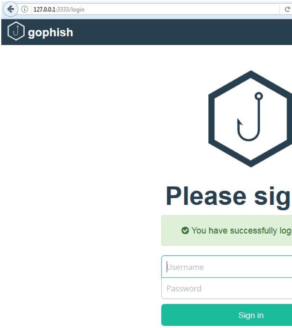 To start the program, run gophish from a terminal window. This launches a script that starts the various components of the Gophish program. Once the script has completed, you are notified that an admin page is running on http://127.0.0.1:3333 (Figure 1). Open a browser on the local machine and log in with the default credentials of “admin/gophish”. Upon logging in, you are presented with a minimalist interface from which you can start working (Figure 2).