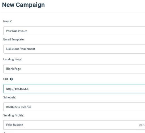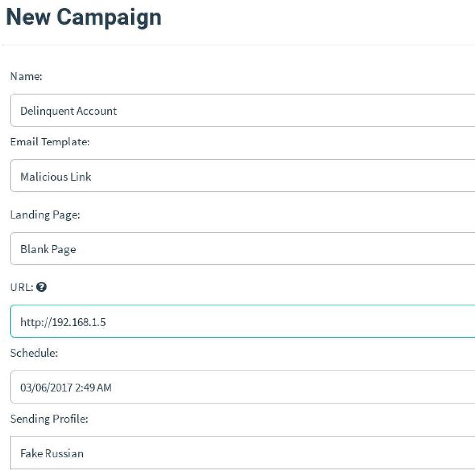 In this example, you are claiming that the user has an unpaid invoice. You don't need a landing page, so set it as “Blank Page” like in the first campaign. Match the rest of the settings to Figure 12 and Launch the campaign. You can use a hostname in the URL field, but since you're not using Gophish to track the campaign, you can just use the the Gophish server's IP.