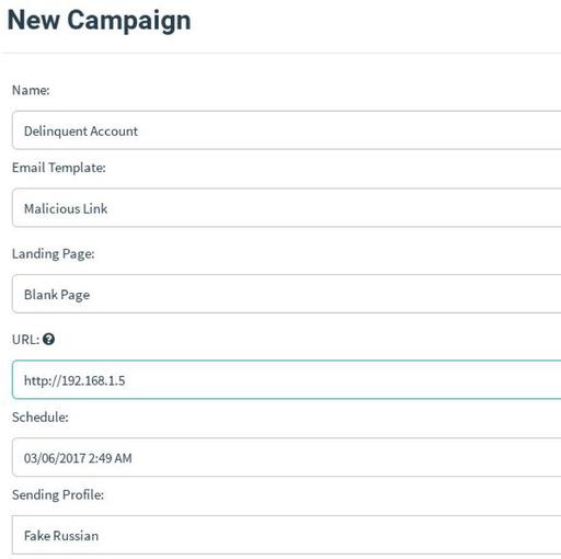 The third and last campaign involves sending users a malicious attachment. This is a very popular way to install ransomware. The two most currently used applications that infect users this way are Adobe Acrobat and Microsoft Word. Unfortunately, Gophish does not currently possess all of the tools needed to test this, so you'll need to set up additional resources for this campaign.