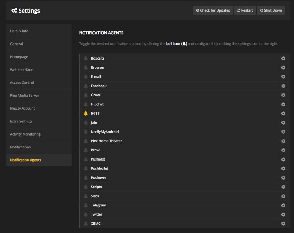 Figure 6 shows my PlexPy dashboard. The data ranges from interesting information (most popular movie) to vital server data (most concurrent streams). I'm a bit of a data nerd, so drilling down into each section is something I do on a regular basis. If you're not as interested (or creepy) as me, PlexPy also has a robust notification system. Figure 7 shows the wide variety of notification agents available. I use the IFTTT notification agent, so I get a quick ping on my phone when server events take place. The notification settings can be tweaked to send whatever information you desire. If you want to know every time someone starts playing a video, you can do that. If you just want to be notified if someone starts streaming multiple concurrent streams, you can set that up too. That is of particular interest to me, because if one of my friends suddenly starts streaming my server files to multiple locations, it probably means that account was compromised. Before I got a fiber connection to my office, I also was concerned about upload bandwidth. Now I just want to know when concurrent streaming happens.