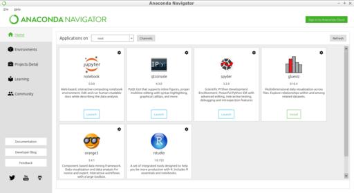 On the first page of the application, you'll see launchers for the major Python software that is available through Anaconda. This includes packages like spyder, orange3 and the jupyter notebook. If they haven't been installed yet, you'll see a button labelled “Install” rather than “Launch”.