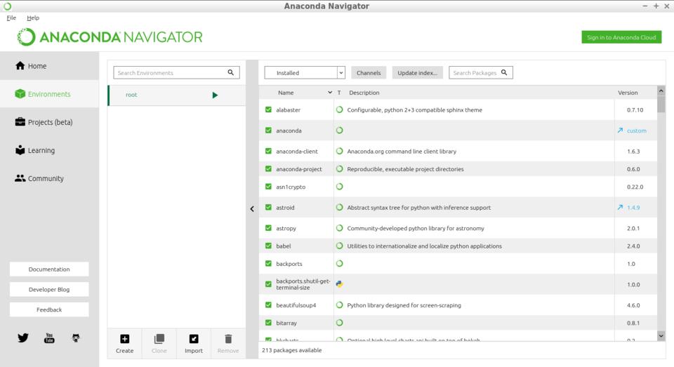 The second page allows you to manage environments within your Anaconda installation. From here, you can manage the installed Python modules, create new environments or clone existing ones. You even can import projects from specification files to create a new copy of an environment. The right-hand side of the window displays Python modules, and you filter based on whether the list is those installed, update-able or yet to be installed.