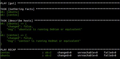 The above will show you something like Figure 1, which is incredibly useful when you're trying to figure out the sort of systems you're using. The nice thing about the debug module is that it can display anything you want, so if a value changes, you can have it displayed on the screen so you can troubleshoot a playbook that isn't working like you expect it to work. It is important to note that the debug module doesn't do anything other than display information on the screen for you. It's not a logging system; rather, it's just a way to have information (customized information, unlike the verbose flag) displayed during execution. Still, it can be invaluable as your playbooks become more complex.