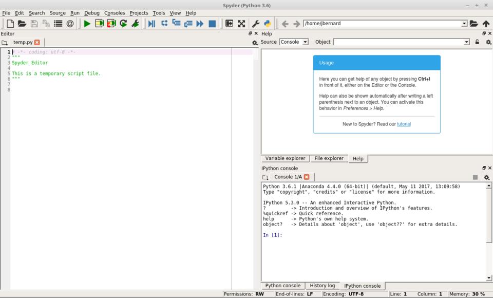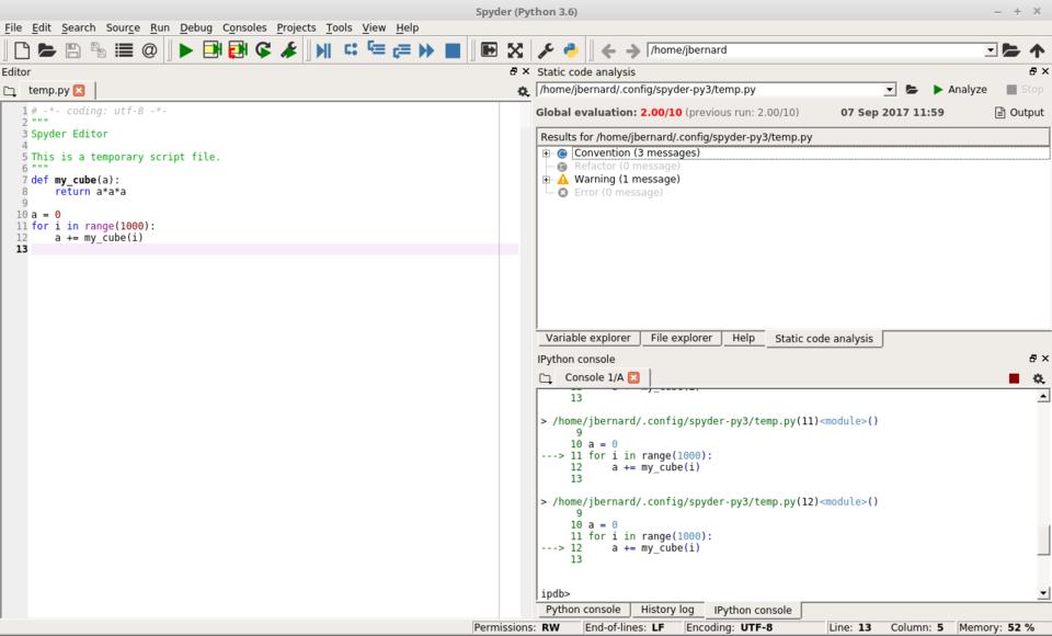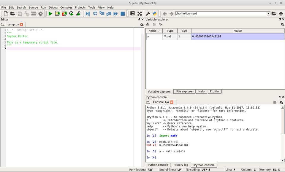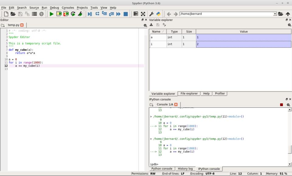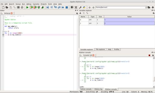 Although this is fine for smaller code snippets, you'll likely end up working on much larger chunks of code. In that case, you can use the editor to write functions and larger pieces. In order to execute this Python code, you can click the green arrow icon, click the menu item Run→Run or press the F5 key. Again, the results are available from within the variable explorer. If instead you click the blue arrow icon (or click on the menu item Debug→Debug), your code will be run within the IPython debugger, which lets you step through your code one line at a time.