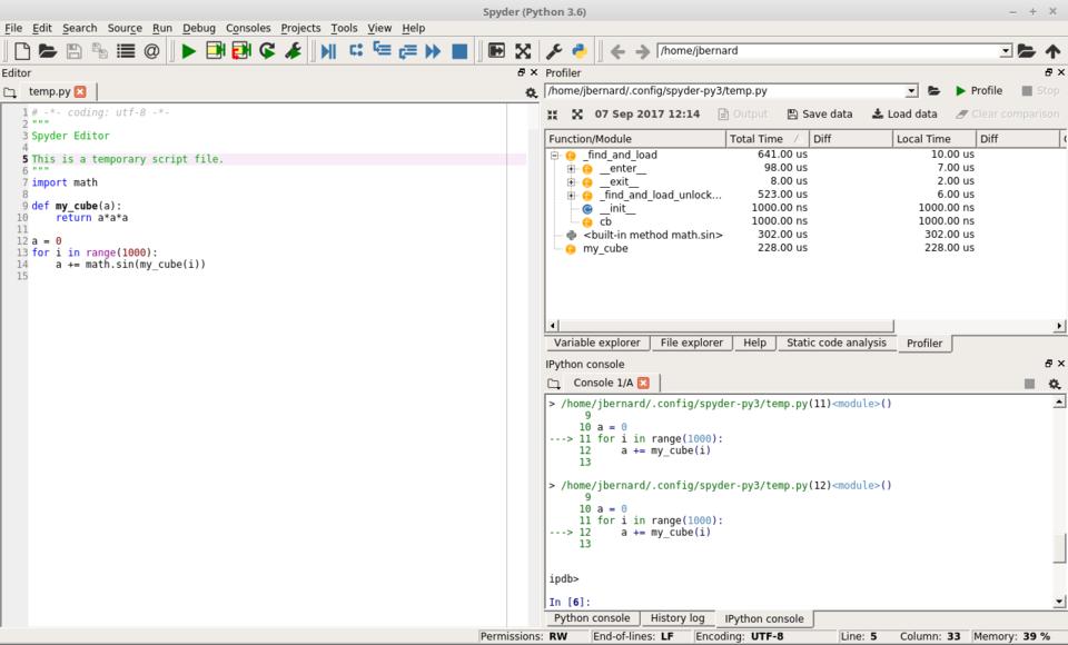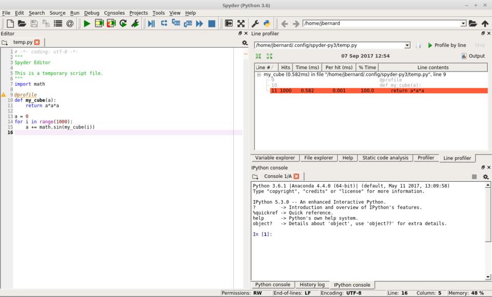 Unfortunately, the default profiler goes down only to the function level, and that may not be fine enough in detail. If that's the case, you can dive into one of the great features of spyder, its plugin architecture. Several plugins are already included within the Anaconda repository. Use the following command to install the line profiler plugin: