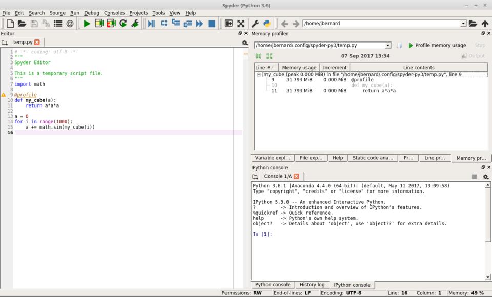 Along with optimizing time, the other parameter you'll want to look at optimizing is memory usage. This is becoming much more important as more and more research is focusing on big data problems. In those cases, you'll want to use the following command to install the memory profiler plugin for spyder: